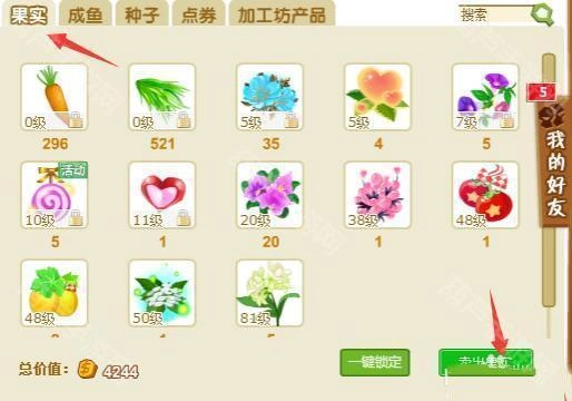 8、最后在新的窗口里,选中第一个果实,这里就可以看见刚才偷取好友的菜和果实了,右下方可以卖出换钱。