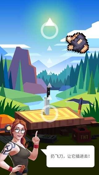 在插着刀具的树桩不远处,有一棵挂着可上下移动靶子的大树。我们需要做的,就是用合适的力度和角度拔出刀具,让它准确击中靶子。不过,不必强求完美命中靶心,稍微有些偏移也没关系,只要没有完全脱离靶子的范围就可以接受。