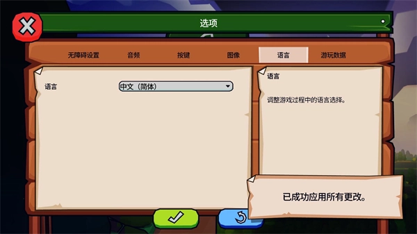 最后选择中文简体,再点击绿色对勾按钮,就能把游戏设置成中文版了。