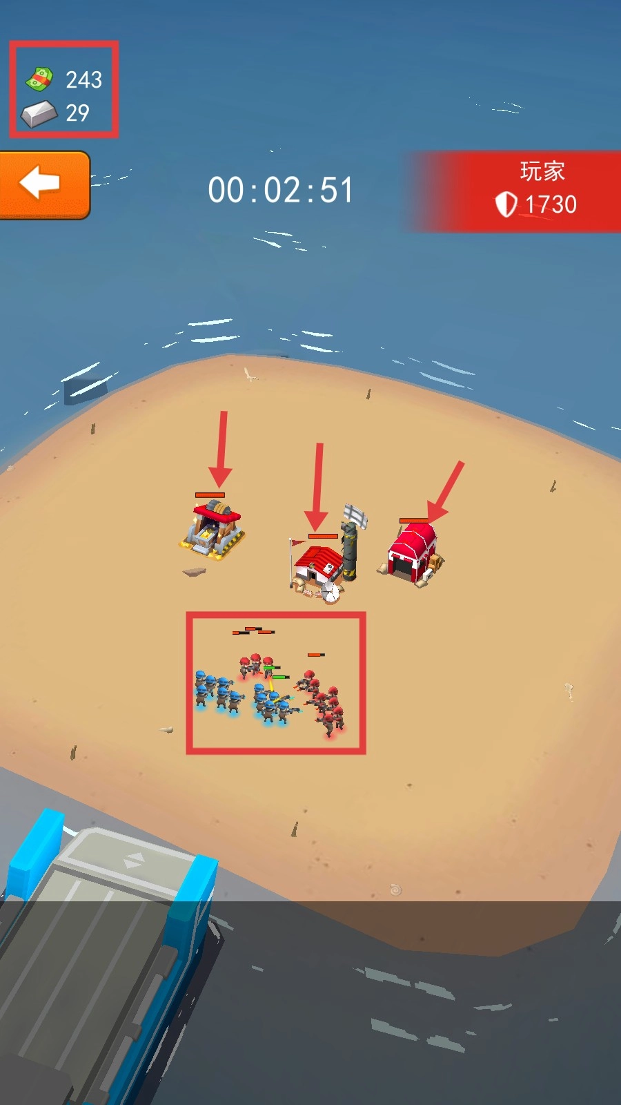 关注资源数量有助于我们做出战斗决策,在确认局势有利后,便可派遣士兵进攻敌方建筑,以此推进战局。
