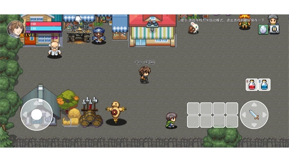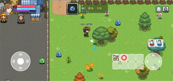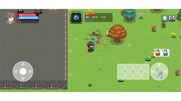 游戏界面的左侧用于操控角色移动,右侧则设有物品栏、攻击按钮以及回复药剂。