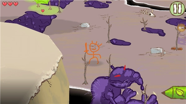 当处于这片蓝紫色熔浆所在的区域时,火柴人会受到多种伤害,大家切勿靠近。下方的树叶画笔是你的武器,在干枯的树枝上绘制一片树叶,就能获得重生,还能消灭即将出现的各类怪物!