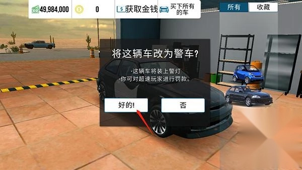 4、要是确定把这辆车改装成警车,就能点击“我的”,这辆车会安装警灯,驾驶它就能够对超速的玩家处以罚款。