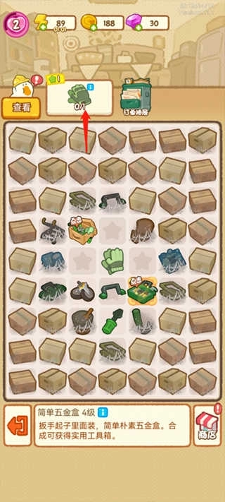 手套堆叠合成是首个引导任务,长按拖动同款手套至合成框,叮咚一声即刻完成。