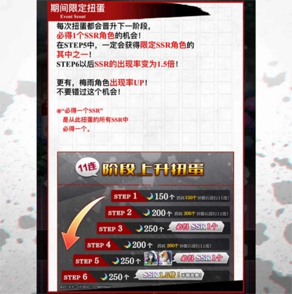 在此之后我们就可以抽活动卡池了,十连抽正常需要250异能石抽取一次,活动卡池一般都是阶段性的,一共分为六个阶段,第一阶段只需要150异能石,第二个阶段需要200异能石,第三个阶段需要250异能石,但是会必得一个SSR卡,第四个阶段重新降回200异能石,第五个阶段需要250异能石,但是会必得一张SSR的活动角色卡,到了第六个阶段以后需要250异能石,但是抽取SSR的几率会提升至1.5倍,而且不限抽取次数。