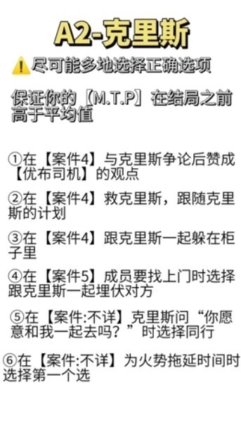 多选择克里斯的选项,最后在警局和克里斯躲着并躲在在一个柜子里保证两人都活着。同时,如果要你在摊主和德米之间选择,选德米那条比较积极的想法。注意,在克里斯线最终事件里反复提及德米或头儿可以跳转到德米线或头儿线。如果不想跳转,选择和克里斯相关的选项,
