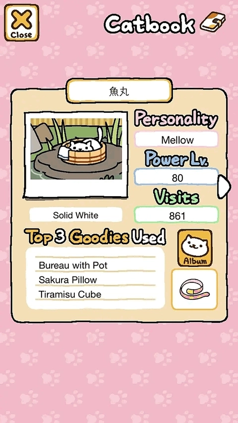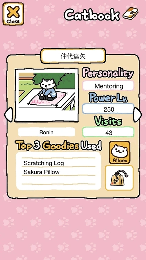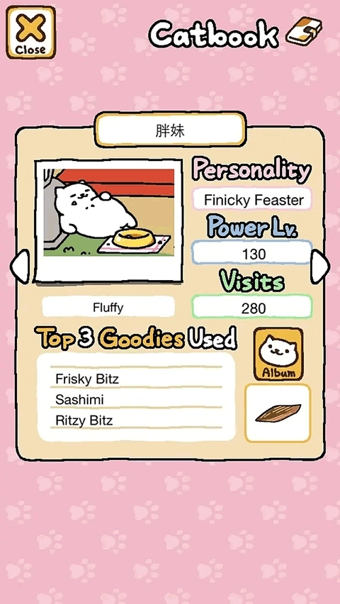 然后就是personality、power、visits,Personality就是字面意思对这只猫咪的性格进行描述,这一点也可以帮助你给猫咪起一个更适合他的名字。Power代表着他的活力值,活力值越高越容易抢到他最喜欢的玩具,活力值低于他的猫就只能玩别的玩具。Visits代表他的造访次数,一般造访过50次左右就会给你小礼物了,但是也不一定。