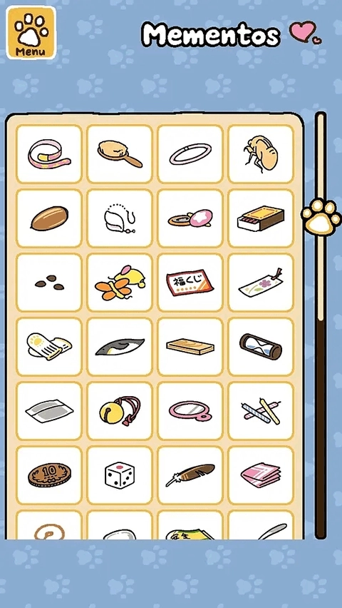 2、礼物清单,就像收集卡片一样,每一次收到猫咪礼物的演绎动画都是一次惊喜。猫咪后院这款游戏总是随着季节的变化更新内容,加一些新猫咪种类和新的道具。至今还有两只猫咪没有送我礼物,她们来的次数比较少,所以收到礼物的概率就低。