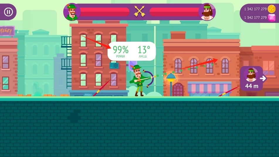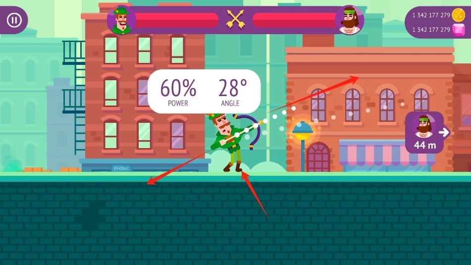 点击射手,按住,移动和拖动,以增加力量和设置角度;