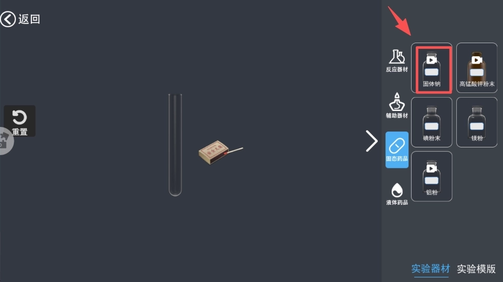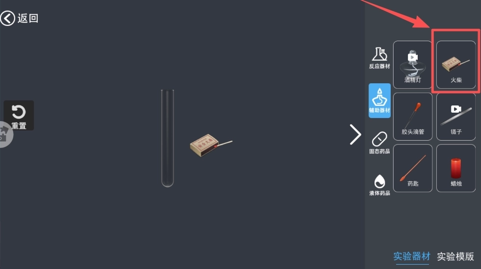 3、进入实验界面后,点击“火柴”等实验器材,即可着手开展实验操作,对真实的实验过程进行模拟。