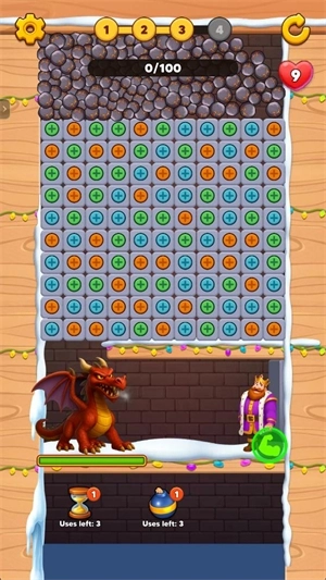游戏的玩法颇具趣味,玩家得消除方块,让高处的石头或其他物品掉落时不会伤到国王。挑战的完成方式是凑齐三个相同方块,要在有限时间里快速消除以保障国王安全,还得不断消除各类方块来触发机关,达成不同目标,感受别样的闯关乐趣。