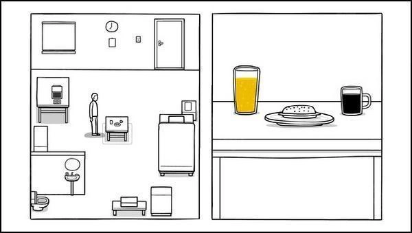 4、点击房间中间的2号位置,利用桌上的食物(将两样饮品拖动饮用完毕,中间的食物点击食用完毕,左侧包装点击放大后疯狂拖动糖包能洒出大量碎屑,总计可达30粒),食用完毕后时间会变为中午11点。