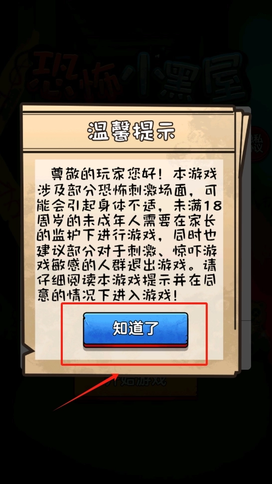 1、点击蓝色的“知道了”按钮关闭提示,接着点击“开始游戏”进入游戏。