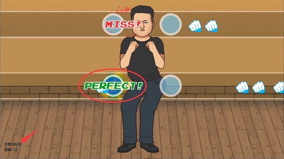2、当拳头移动至目标框范围内时,迅速点击屏幕,精准命中即可触发完美击打判定效果。