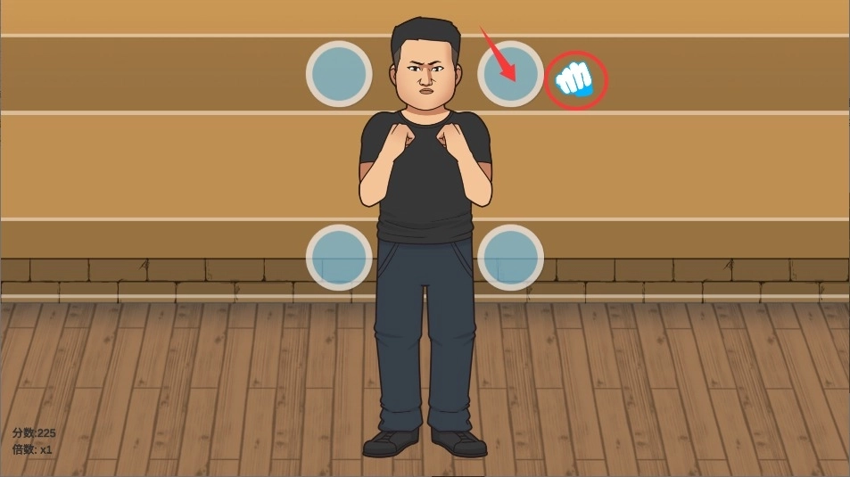 1、进入游戏后点击开始按钮,留意屏幕上摇摆拳头的运动路径,找准最适合的出手时机。