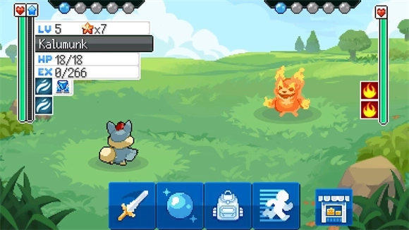 5、战斗时点击下方第一个按钮可释放技能,第二个按钮能切换精灵,第三个按钮用于使用背包道具,第四个按钮则是逃跑功能。