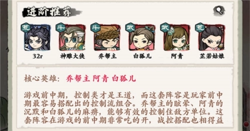 核心英雄为乔帮主、阿青与白狐儿。在游戏前中期阶段,控制类型的英雄堪称主力,这套阵容则是玩家在前中期最易凑齐的控制流搭配。乔帮主的眩晕技能、阿青的沉默效果以及白狐儿的麻痹能力,可对敌方单位形成有效的控制。该阵容在前中期表现出色,战斗与控制的搭配也十分协调。考虑到中期往往面临卡牌短缺的情况,这套阵容无疑是优先选择。
