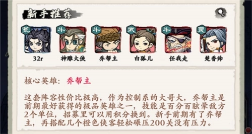 核心英雄为乔帮主。这套阵容的性价比相当高,乔帮主作为控制系的顶尖角色,是前期较易获取的极品英雄之一,其技能能百分百眩晕敌方两个单位,且可通过招募系统用积分兑换。新手在前期若拥有乔帮主,再搭配几位橙色侠客,轻松通过200关毫无压力。