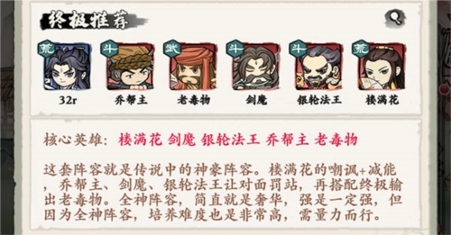 核心英雄组合为楼满花、剑魔、银轮法王、乔帮主与老毒物,这套配置正是玩家口中的神豪阵容。楼满花负责嘲讽敌人并削减其能量,乔帮主、剑魔和银轮法王能让对手陷入无法行动的罚站状态,再配合作为终极输出点的老毒物,整套全神级阵容堪称奢华顶配。强度自然毋庸置疑,但由于所有英雄均为神级品质,培养所需的资源和难度极高,建议根据自身实际情况谨慎选择。