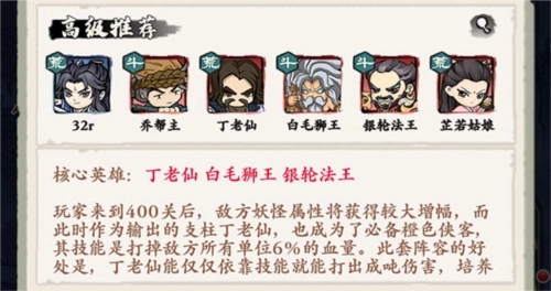 核心英雄包括丁老仙、白毛狮王和银轮法王。当玩家闯到400关时,敌方妖怪的属性会有显著提升,这时作为输出核心的丁老仙就成了自创武林游戏里不可或缺的橙色侠客,他的技能是对敌方所有单位造成6%的血量伤害。这套阵容的优势在于,丁老仙单靠技能就能输出大量伤害,而且培养所需的成本很低;不过这套阵容也有难点,那就是白毛狮王和银轮法王的获取难度比较高,而丁老仙可以通过招募积分兑换来获得。