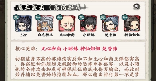 核心英雄组合推荐无心和尚、小昭妹、神仙姐姐与楚香帅。前期练度较低的英雄们,其伤害总和往往不及无心和尚的反弹伤害;搭配神仙姐姐无视防御的强力单体输出,再加上小昭妹提供的全体攻击增益,能让队伍输出能力大幅提升;若此时还有楚香帅持续恢复血量作为辅助,拿下输出排行榜首位并非难事。