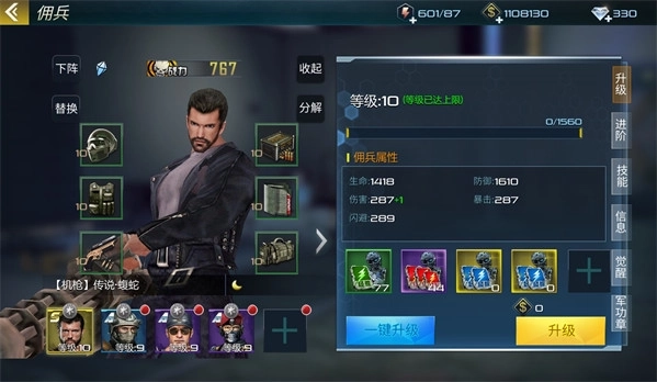 佣兵分为不同的等级,从高到低依次是SSS、SS、S、A、B级,其中SSS级是实力最强的佣兵。在佣兵界面的右侧能看到基础属性相关内容,佣兵可以通过升级自身等级和技能等级来提升实力。对于低品质的佣兵,还能通过进阶的方式进一步增强战斗力。
