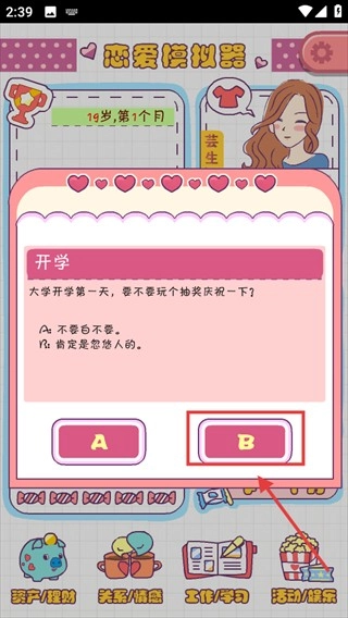 2、开学抽奖选择【B】(或【A】),不同选择影响后续剧情,需结合喜好和走向决定。