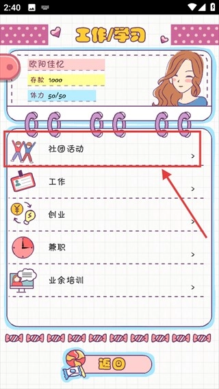 3、在【工作/学习】界面点击【社团活动】,参与社团拓展社交或提升能力,助力养成。
