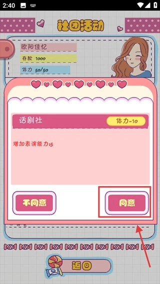4、面对话剧社活动点击【同意】,消耗10体力增加5表演能力,助力个人技能发展。