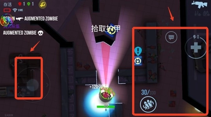 4、进入游戏后,玩家可通过左侧按钮操控角色移动方向,右侧按钮则对应攻击、换弹、治疗等功能。