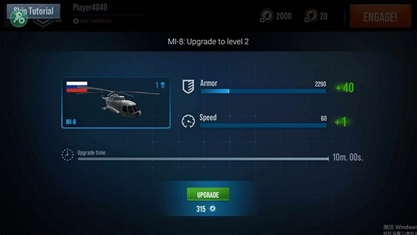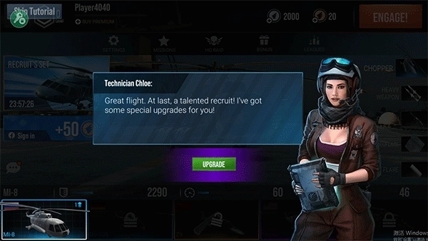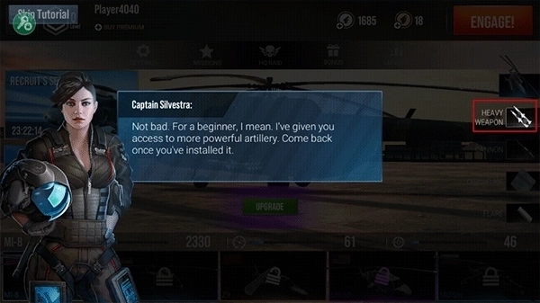 1、进入游戏后,首先得给装备升个级!点击右下角的“直升机”就能完成升级操作。