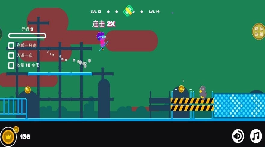 3、每个关卡都配有专属任务,比如拦截一只鸟、完成一次闪避、收集金币等,完成这些任务就能解锁下一个关卡。