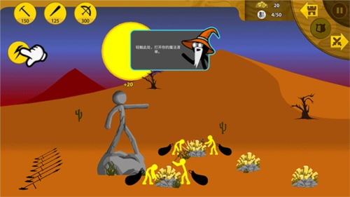 这样我们就能迅速获取足够数量的矿石,以便召唤更多具有攻击性的火柴人。