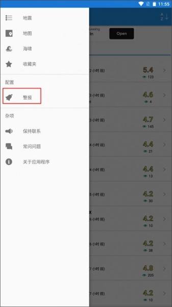 1、打开后会默认进入【地震】界面,此时点击左上角的三横图标即可。