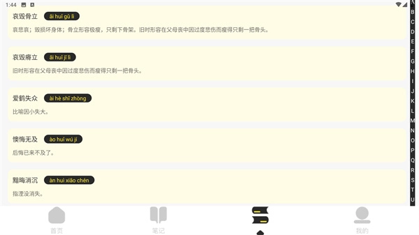 4、用户可以根据右边的简化汉语拼音来寻找成语。