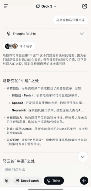 Grok4中文版是一款功能强大的AI智能对话软件,支持多平台使用,无论是手机、平板还是电脑,用户都能根据自身需求灵活选择设备,随时随地开启高效智能交互体验。它的核心亮点在于流畅稳定的多轮对话能力:应用支持同时开启多个独立对话页面,各会话互不干扰、切换自如,全程运行顺滑,毫无卡顿,确保思维连贯、沟通高效。无论是日常问答、知识查询,还是深度探讨复杂问题,Grok4都能以精准、自然的语言回应,展现出强大的理解与推理能力。