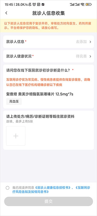 5、最后请将处方/病历/诊断证明等既往就诊资料上传,最后点击提交即可购买处方药。