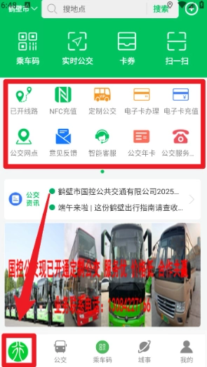 1、打开鹤壁行,在首页可看到乘车码、实时公交、卡券、扫一扫等出行服务入口。