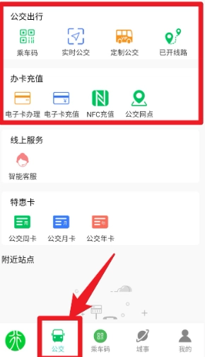 2、切换到底部“公交”板块,可使用已开通路线、定制公交、办卡充值及电子卡处理等功能。