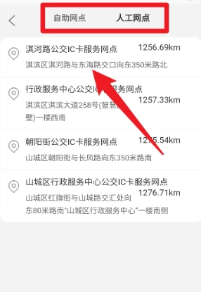 3、点击“公交网点”可切换查看“自助网点”与“人工网点”,支持查看地址、距离与所在区域。