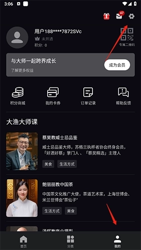 1、启动大渔大师课应用,点击底部导航栏的“我的”选项,接着点击页面右上角的“设置”按钮。