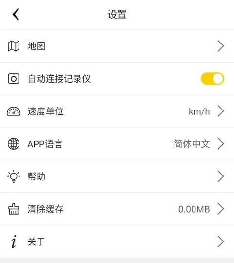 用户点击首页右上角的齿轮按钮就能进入设置页面,在该页面可切换语言、地图、速度单位,也能查看记录仪的使用帮助。