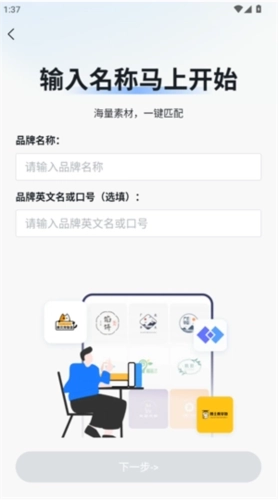 2、输入你心仪的名称与品牌信息,点击下一步,稍作等待(仅需几秒),系统便会生成若干不同风格的LOGO供你自由挑选。