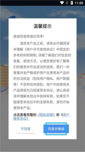 ·打开财仝驾考,阅读弹出的温馨提示,点击【同意并继续】;