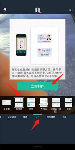 2、先选择“证件”选项,接着在其中选择“身份证”选项,最后点击“立即制作”选项就可以了。