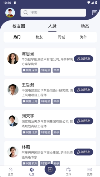 社区内主要设有校友圈、人脉与动态三大不同版块,能让用户实时体验各类功能。