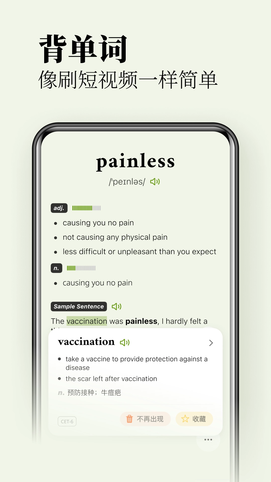 无痛单词是一款专为专业场景打造的手机记单词工具,助力你轻松攻克英语单词背诵难题。它支持在线记忆功能,操作直观简便,无论何时何地都能快速进入单词学习状态,大幅提升记忆效率,还能随时进行单词速刷练习,精准查缺补漏,让单词记忆更轻松高效。
