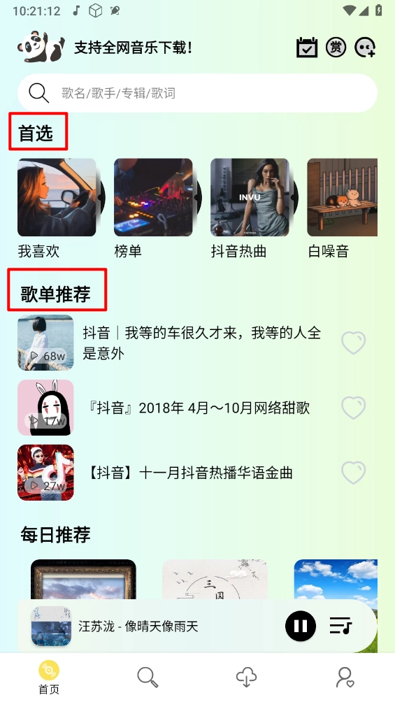 先完成软件安装,进入首页后,就能看到抖音热曲、各类榜单以及歌单推荐等内容。