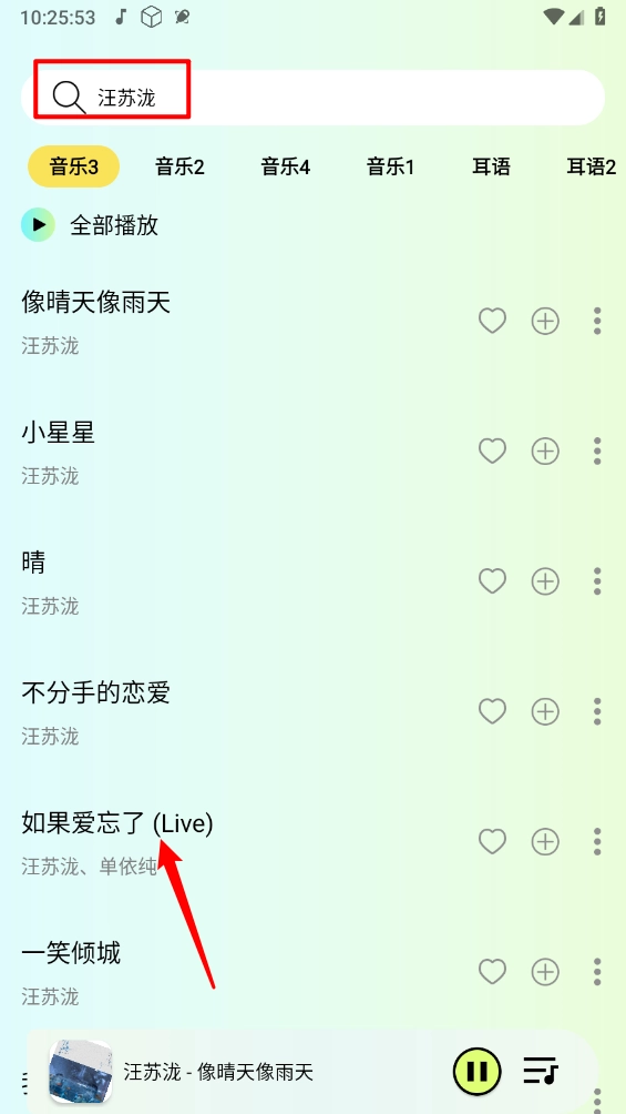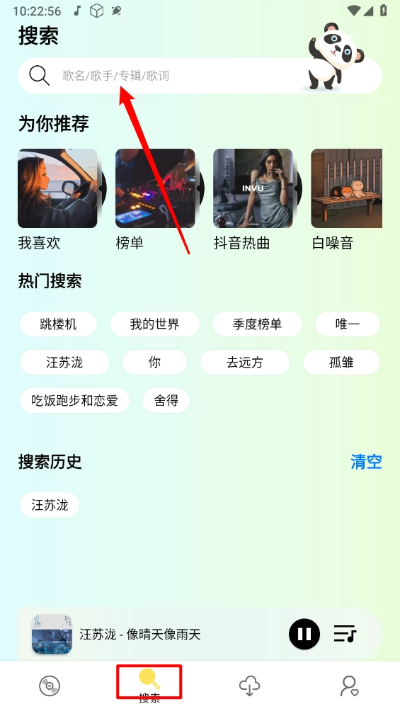 切换到“搜索”板块,点击顶部的搜索框,可搜索歌名、歌手、专辑或歌词内容。