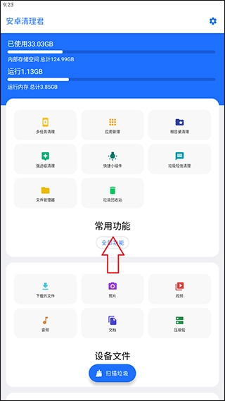 1、在魔趣网安卓清理君,打开软件在主页中点击扫把图标的按钮就可以全面扫描手机垃圾